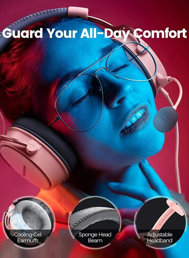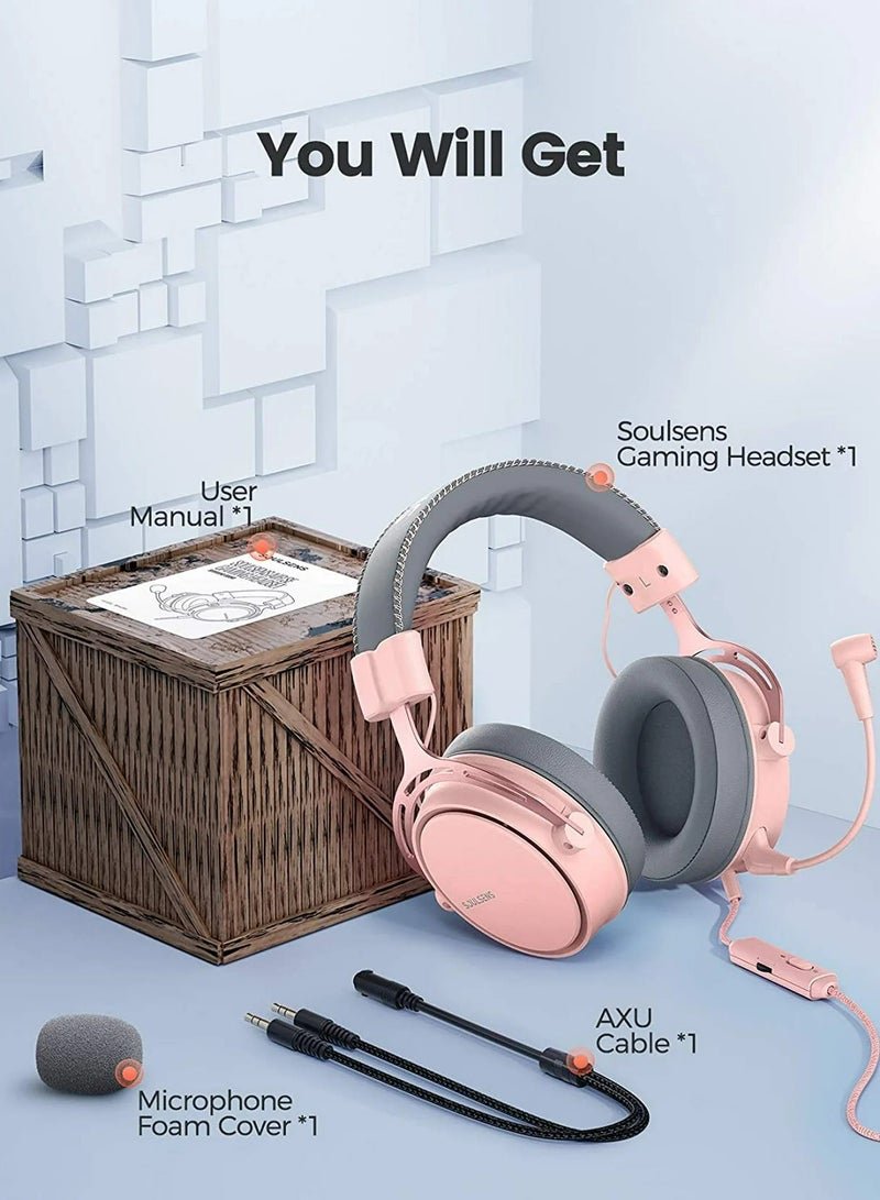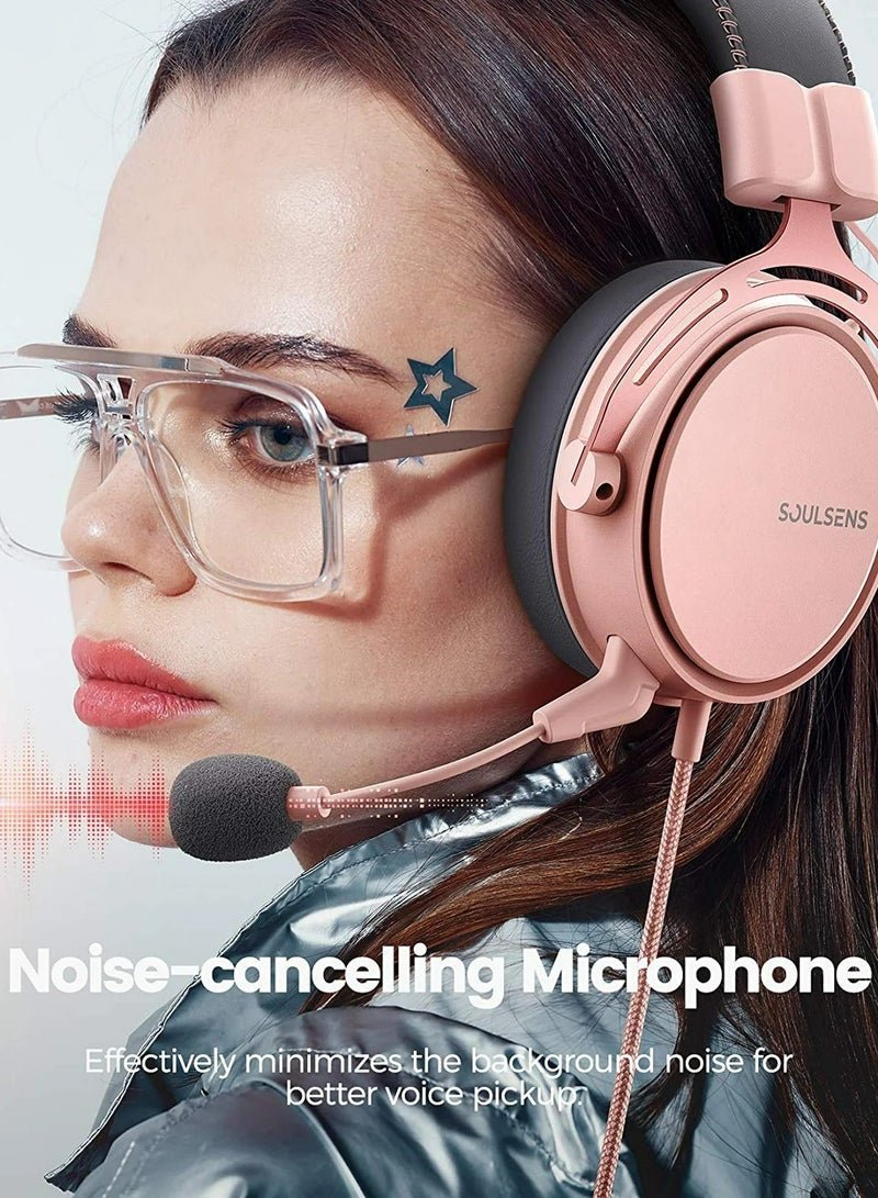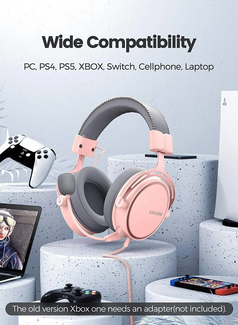 Soulsens Air SE Gaming Headset with 3D Bass,Xbox / PS4 / PS5 / NS / PC Over-Ear Computer Headset with Noise Cancelling Mic, Ultra Light Soft Memory Earpads Gaming Headphones Pink